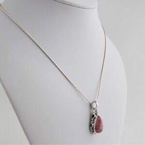 Sterling silver rhodochrosite pendant necklace on new sterling silver snake chain. Natural semi precious gemstone. This one of a kind piece has a beautiful pink rhodochrosite teardrop stone. It is perfectly captured in a handcrafted sterling silver frame with metal work design details. Marked and tested positive for .925 silver. Pendant is pre-owned with normal signs of wear such as light surface scratches and patina. May require polishing if buyer chooses. Please refer to photos.