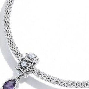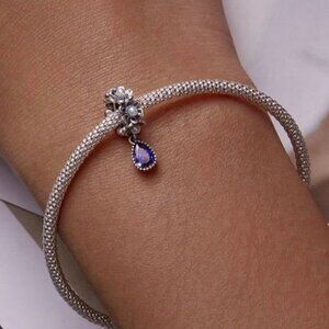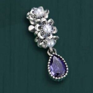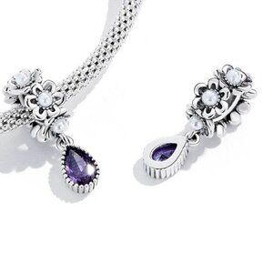 A gorgeous pear shaped crystal cubic zirconia stone hangs from a sterling silver floral shaped bail with shell pearls at the center. Stunning on its own on a necklace or nestled amongst floral and love charms. this is a unique piece to add to your bracelet.
