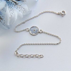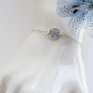 This dainty bracelet is solid sterling silver and was handmade by me and is brand new! The pretty little forget me not is real and was grown in my garden and carefully preserved. The round bezel is about 1/2 inches in diameter and the forget me not is safely encased in jewelry grade resin. The chain is 7 inches long and has a one-inch extension so it will fit most people. It is pretty and minimalist and would make a lovely gift. Forget me nots are often given as a bereavement gif for someone who has suffered the loss of a loved one. It will arrive to you beautifully packaged in coordinating tissue and tucked into a pretty little organza bag decorated with a satin flower! All ready for gift giving to a lucky someone or even for yourself!
