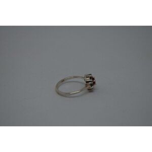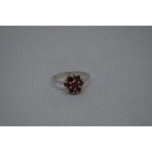 Beautiful, delicate sterling silver ring with 7 small reddish orange gems in a flower pattern. I don't know the type of gem; I thought maybe garnet but the hue seems too orange for garnet. Stamped 925 inside the band. Size 5.75. Weight 2.4 grams.