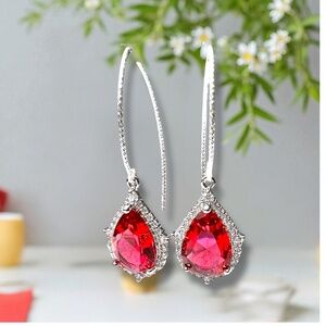 These radiant earrings feature rich ruby-red gemstones framed by shimmering CZs. Elegant, eye-catching, and perfect for special occasions or everyday glamour.
