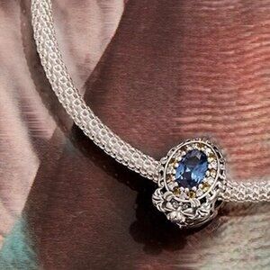 A stunning sapphire blue cubic zirconia stone is surrounded by yellow and clear smaller pave stones, all set in sterling silver. Just such a regal looking mix. It reminds us of a magic mirror. What is your wish as you look into it?