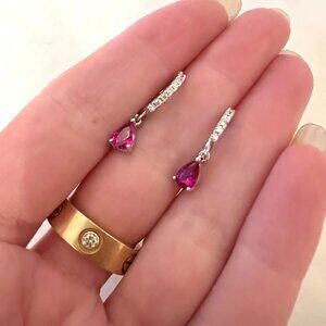 Whoa. Maybe I should keep these. These stunning sterling silver earrings (stamped .925, check pictures) feature a hoop studded with CZs, with a small lab grown ruby hanging underneath. Dainty, sweet, and a perfect present. Hoops close tightly with a built-in clasp. Two available - perfect for you and a friend!
