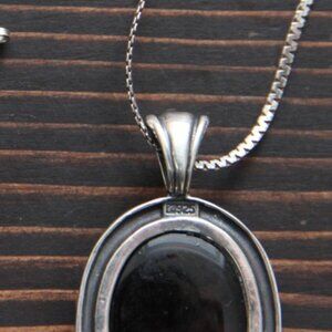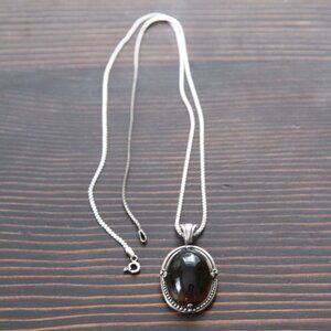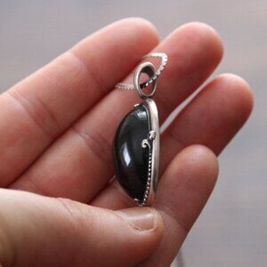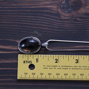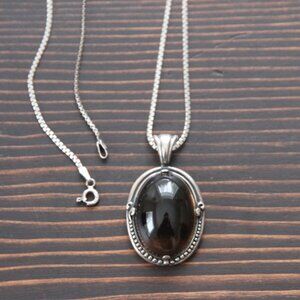 Beautiful sterling necklace with large cabachon cut, smokey quartz pendant in 925 silver. Pendant is marked 925 and measures 1.5 inches long. Sterling silver chain is 22 inches and is hallmarked 925 on O-ring clasp. Beautiful piece is in good condition, and makes a lovely additon to your smoky quartz collection.