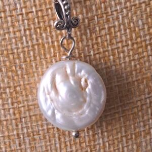 a delicate sterling silver chain, a stunning coin freshwater pearl pendant takes center stage, its natural luster and subtle sophistication captivating the eye. The pearl, a delicate sphere of creamy white, is a testament to the beauty that arises from nature's slow and intricate processes, Suspended from an intricately designed loop, The combination of the delicate chain and the intricate loop not only enhances the pearl's natural charm but also adds a touch of refined complexity, making this piece a versatile addition to any jewelry collection. Whether worn as a subtle accessory during the day or as a striking focal point at a formal event, this necklace promises to be a treasured piece, reflecting the wearer's appreciation for both beauty and artistry.