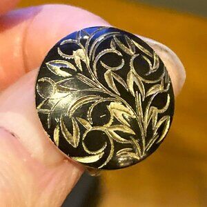 Niello is a black mixture of several metals used as an inlay on engraved or etched metal, especially silver. These leafy niello earrings are about 3/4 inch in diameter ad feature screw backs.They are marked Sterling and SK, which research suggests was a Japan jewelry maker. In very good condition, with minor tarnish. (h)