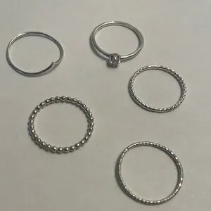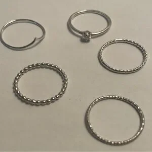 1 x silver ring with a point 1 x silver ring with a pearl 2 x textured silver rings 1 x silver bubble ring All sized 5.5