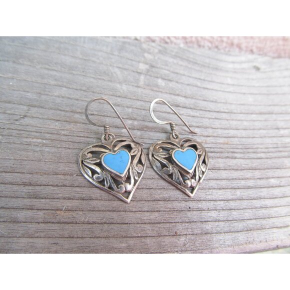 A set of sterling silver heart earrings with turquoise heart centres. A gorgeous set of silver and blue boho festival drop earrings that would make a great vintage jewelry gift for her. In very good condition with minimal signs of wear.