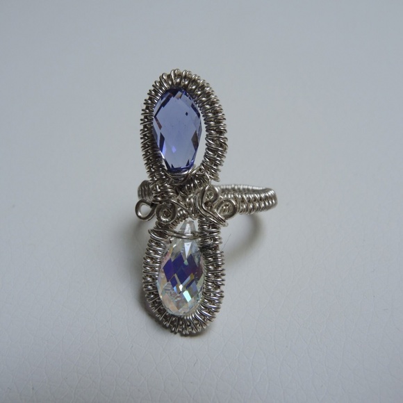 Bespoke Sterling silver wire wrapped ring with clear and blue Swarovski crystals