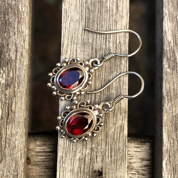 Gorgeous sterling silver with garnet stone dangle earrings. Stamped sterling with 925 marked on back (see photo). Very good used condition.