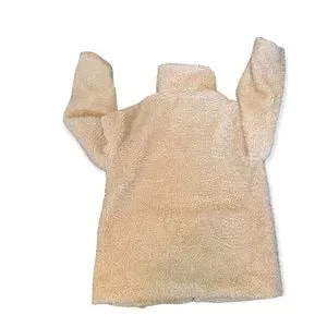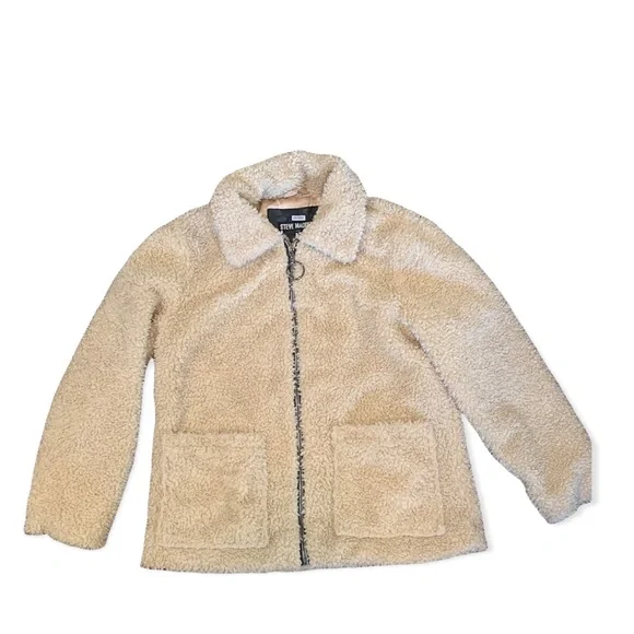 A cream coloured sherpa jacket with a silky lining and a relaxed oversized fit. Great for layering.