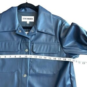 Faux Good Measure Shacket is a sophisticated, vegan leather shirt jacket with an oversize fit, button-front, and front pockets.