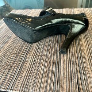 These Steve Madden black patent leather Mary Jane heels are adorable. They have a scalloped perimeter, which is a sweet detail that makes these shoes stand out. The rounded closed toe makes these shoes very comfortable. The thicker heels, which are 4” in height, also add to the comfort and stability of these shoes. They are in excellent condition.
