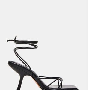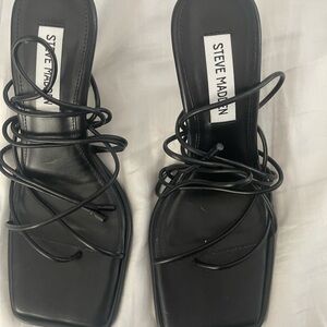 Elegant black strappy heels. Sleek design with a square toe. Perfect for any occasion.