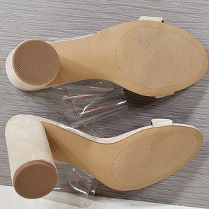 A broad clear strap bridges a simple slide sandal with an uncommonly tall column heel.