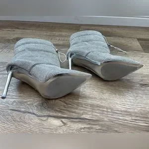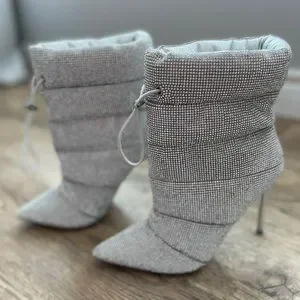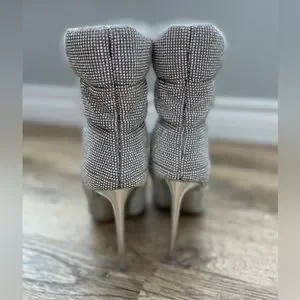 Gorgeous glittery rhinestone boots by Steve Madden. These are so beautiful and so sparkly in the sun! Very comfortable but too small for me so I bought another pair in a 7.5. The left boot drawstring came broken when I bought them, you don’t need it as it’s only aesthetic not functional. Brand New without tags, only tried on.
