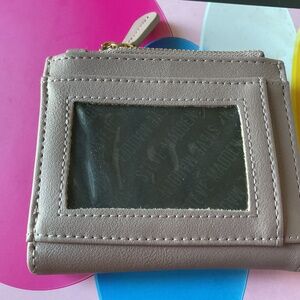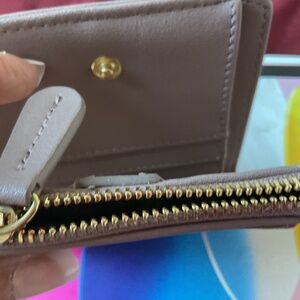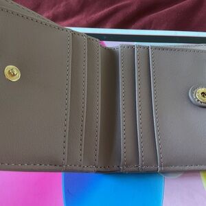 Snap closure, 6 credit card slots, 1 large billfold slot,1 photo id compartment, zippered coin holder, front gold logo, gold hardware