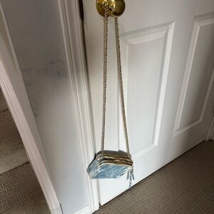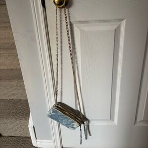 Cool cloth cross body or shoulder bag with gold chain strap. 2 zippered compartments, a little bit of wear inside, very clean