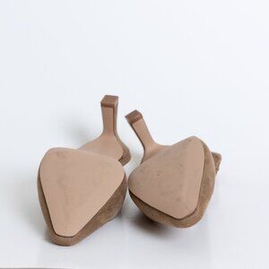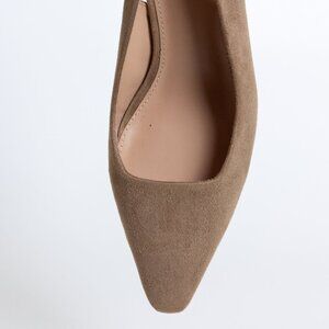 Chic and versatile Steve Madden “Gorgie” slingback heels in a warm tan/taupe shade. Soft suede-look fabric upper with a pointed toe and modern mid block heel – the perfect neutral pump to dress up jeans, workwear, or occasion outfits. Slingback strap with elastic for a secure, comfortable fit.