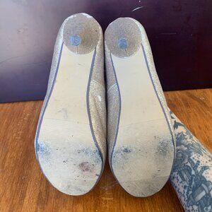 Vintage Y2K Steve Madden gold glitter, peep-toe platform heels. Gently worn with slight stiffness due to storage.