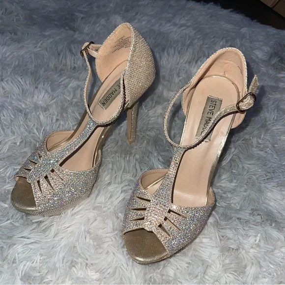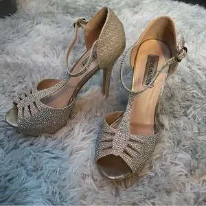 Heel height: about 4.5 inch Size: 6.5 womens Worn once for graduation These sparkles are beyond breath taking !