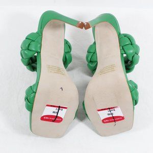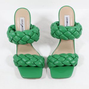 Steve Madden Kenley Braided Stiletto Slides - Green 7.5M Brand new Excellent condition A sleek stiletto heel and braided straps create an eye-catching sandal with a softly squared toe. Vegan leather upper Squared open toe Padded insole Synthetic sole Fits true to size Stiletto heel 4.5"