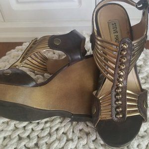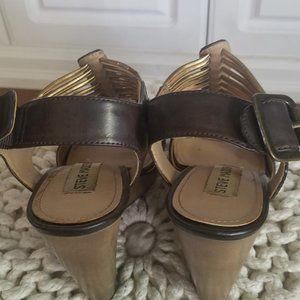 Gorgeous worn once, perfect condition, thick leather with accents and large buckle detail. 4 7/8" inch back with small 1" front super easy to walk in.