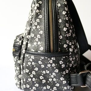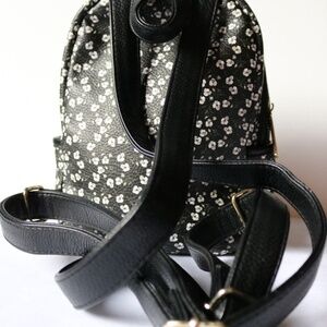 Steve Madden mini purse backpack, black faux leather with white floral design and gold colored zippers. The bag's dimensions are 13 x 14 x 4 inches (width, height, and depth). Small zippered area on front of bag and another small zippered pocket inside main compartment. Strap is adjustable. Pre-owned but in excellent condition. Smoke-free, pet friendly home!