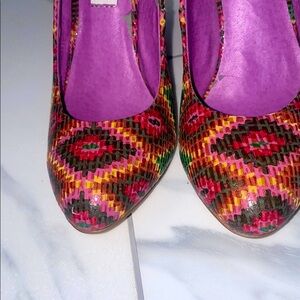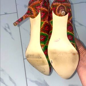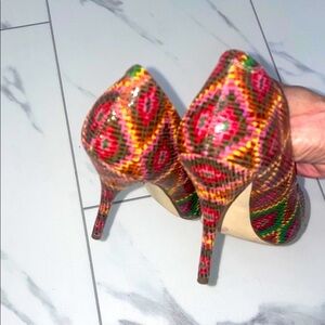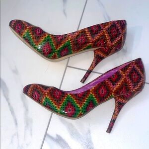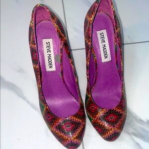 Steve Madden heels, featuring a vibrant purple and pink color palette. Designed with a classic pump silhouette and a sophisticated 4 inch high heel, these shoes are perfect for making a statement at formal events. The bold colors and elegant design ensure you'll stand out in any crowd. In excellent condition.