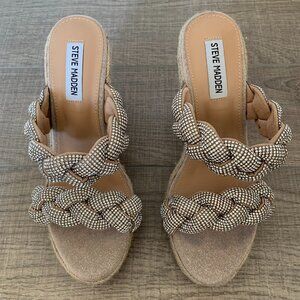 Steve Madden straw wedge sandals. Braided straps covered in silver rhinestones. 4.5 inches height. Size 8. Soft material inside straps to make comfortable. Can dress them up or down. Only wore once for a special occasion and received a lot of compliments.