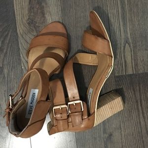 Steve Madden cognac sandals. removed one of the bands to make it more simple. no Impact to the shoe comfort. very trendy. come with the box