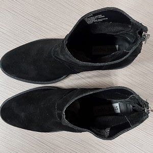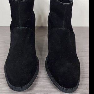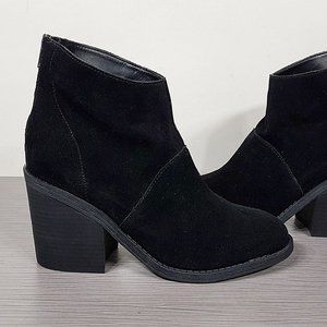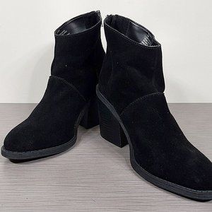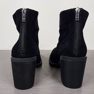 A svelte almond toe and a block stacked heel further the of-the-moment look of a streetwise bootie cast in nubuck leather.