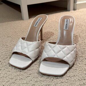 A short stiletto heel transformed what would be a basic slide into the effortlessly edgy SIGNIFY sandal! The heeled mule features a squared toe and padded upper following this seasons trends.