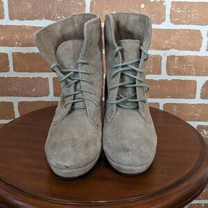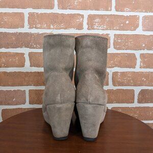 Very good condition. Taupe suede wedge ankle boots with polyester lining. Some marks on toes as shown. 3" heel.