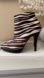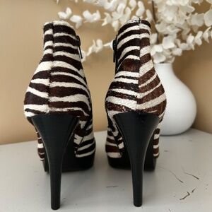 Make a statement in these Steve Madden Survey 1 Dark Brown and Cream Zebra Booties made with Pony Hair Leather. Stiletto heels are 4.5" with 1" platform. Shaft height 5". Made in Brazil. Leather upper Synthetic sole. Size 7.5