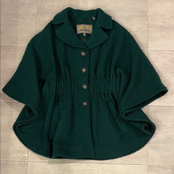 Elegant Steve Madden textured outerwear cape coat in rich green. Features intricate detailing, adjustable on the inside!
