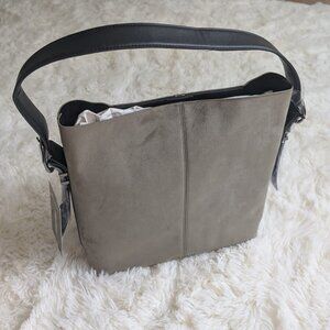 Elegant Gray Suede Handbag with Black Faux Leather Strap