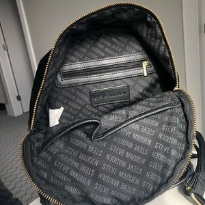 This is a velvet backpack with a gold print and gold hardware. - No obvious signs of wear, very high quality