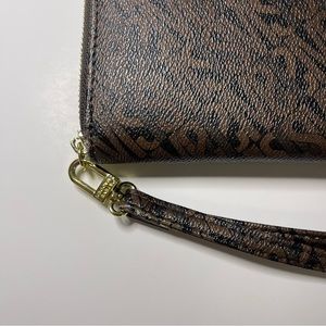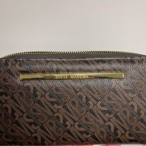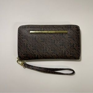 Steve Madden Wallet Large Zip Around Brown Leather Gold Wristlet Wrist Strap