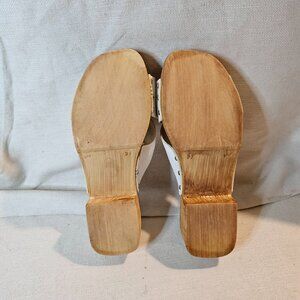 Wood Sole. Block Heel. Criss Cross Leather Toe Straps with Stud Detail.
