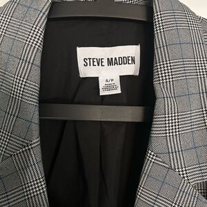 Elegant Steve Madden blazer with a gray and blue plaid pattern. Perfect for professional settings.