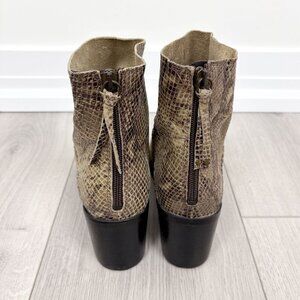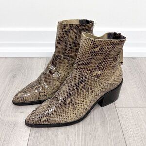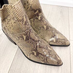 These sleek NWT Steve Madden ankle boots feature a faux snakeskin print in rich shades of brown, with a pointed toe and stacked heel for a polished, edgy silhouette. Crafted from genuine leather and finished with a side zip closure, these boots are ideal for dressing up denim or pairing with a midi dress for a statement look. Brand new with tags, never worn.