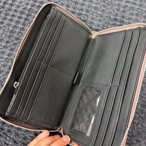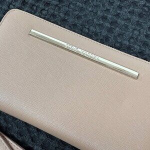 This chic pink Steve Madden wristlet clutch is the perfect blend of style and function. Designed with a saffiano-style textured finish and zip-around closure, it opens to reveal a well-organized interior with card slots, an ID window, and space for bills, receipts, and your phone. The detachable wrist strap adds convenience for on-the-go use. Great as an everyday wallet or compact clutch for events.