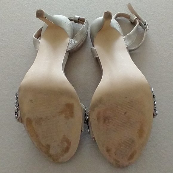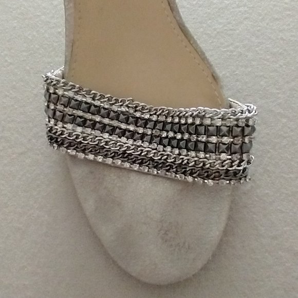 Steve Madden size 7 stiletto heels with silver, gun metal, and rhinestone embellishments. Heel height is approximately 4.25" (see last pic). Previously worn - good condition, signs of normal wear shown in pics.