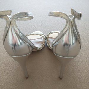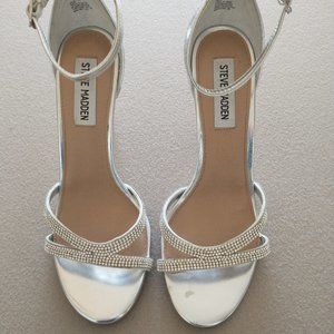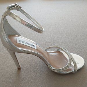 Steve Madden size 7.5 silver metallic stiletto heels with rhinestones. 4.25" heel height. Previously worn. Perfect for a night out on the town, wedding or prom. Condition is great, not excellent, because one of the tiny rhinestones is missing on the front of the right sandal - see pic. Otherwise, only slight wear as shown in the other pics.