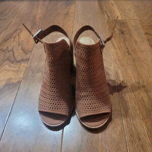 Steve Madden tan, open-back wedges with buckle