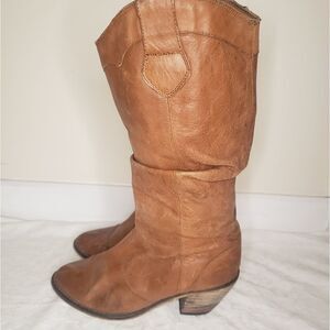 Lightly distressed tan brown leather slouchy cowgirl riding boots, by Steve Madden.