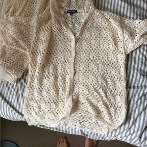 Stylish crochet design. Button down front. Short sleeves. Perfect for layering.