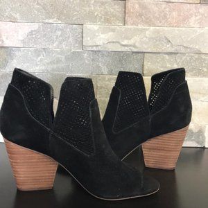 Tiny diamond perforations at the ankle detail this open toe bootie.