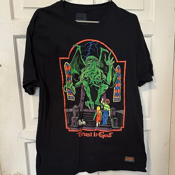 Black t-shirt featuring a unique Steven Rhodes graphic design. Please see pictures